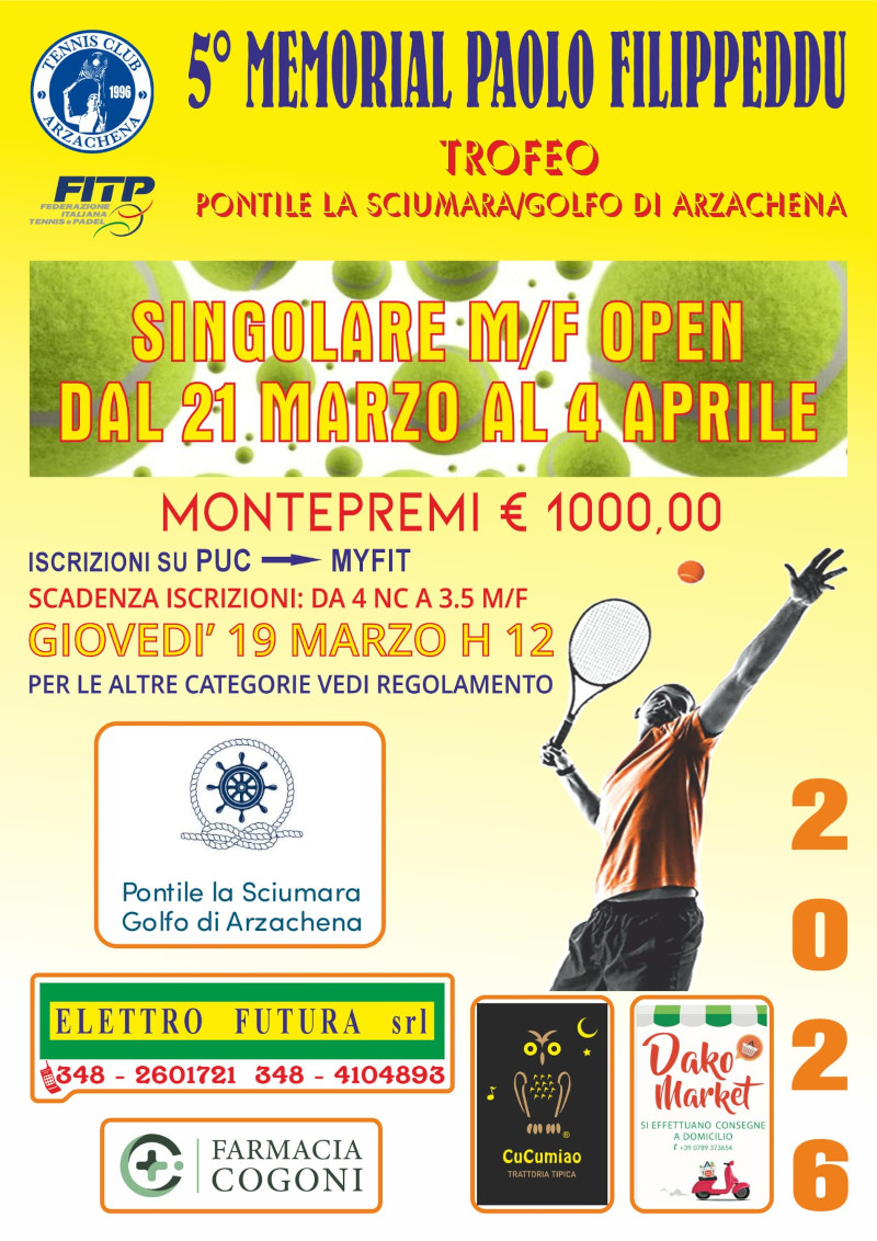 È in programma il 4^ Memorial Paolo Filippeddu 2025 – Trofeo Pontile La Sciumara/Golfo di Arzachena, torneo 2^, 3^ e 4^ cat. maschile e femminile dal 21 Marzo al 4 Aprile con montepremi in palio di 1.000€.